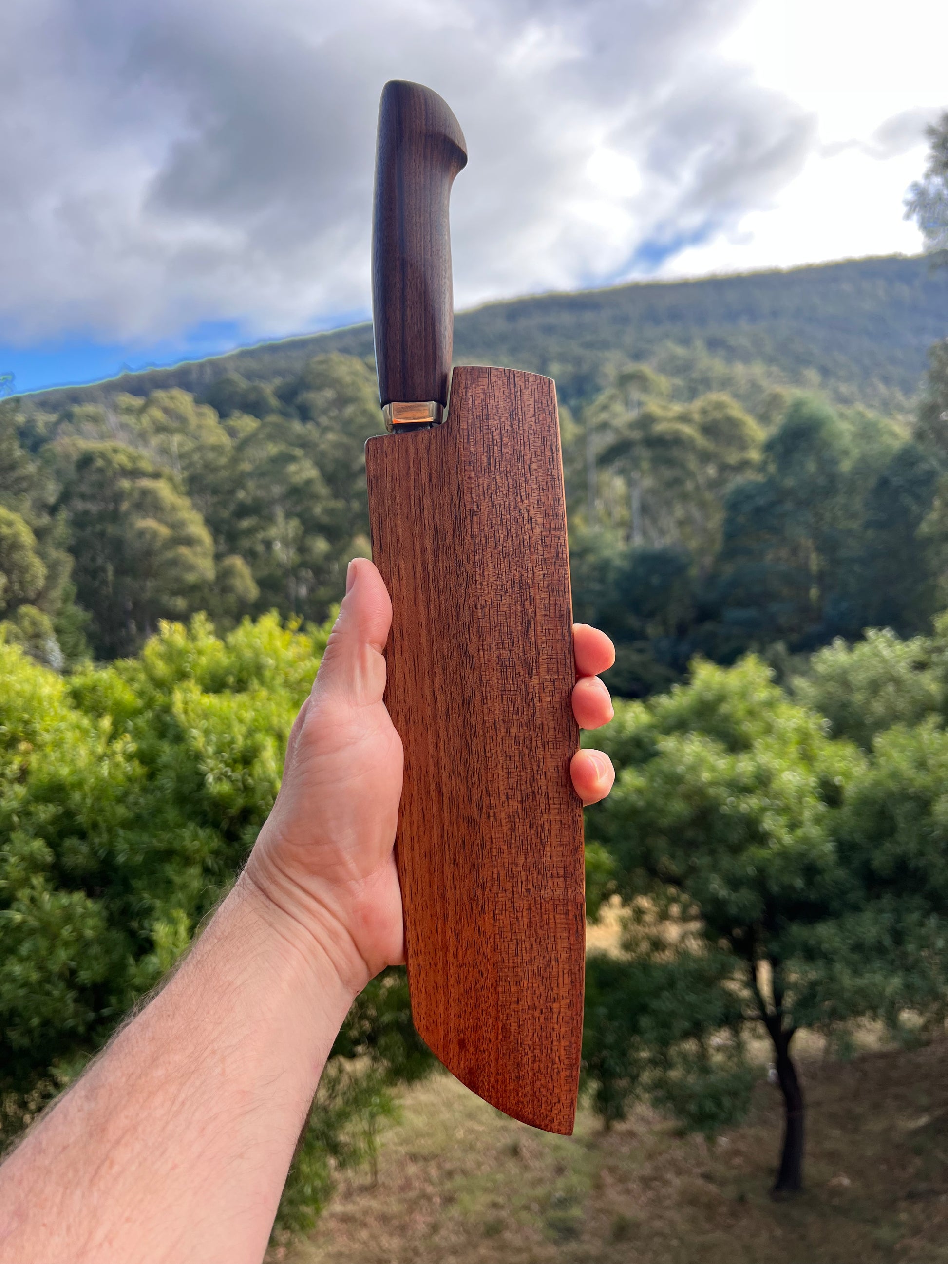 The handle is Tasmanian blackwood with a recycled bronze bolster, sculpted to hold the users hand in place and create a comfortable connection to the blade. The knife is accompanied by a blackwood sheath.