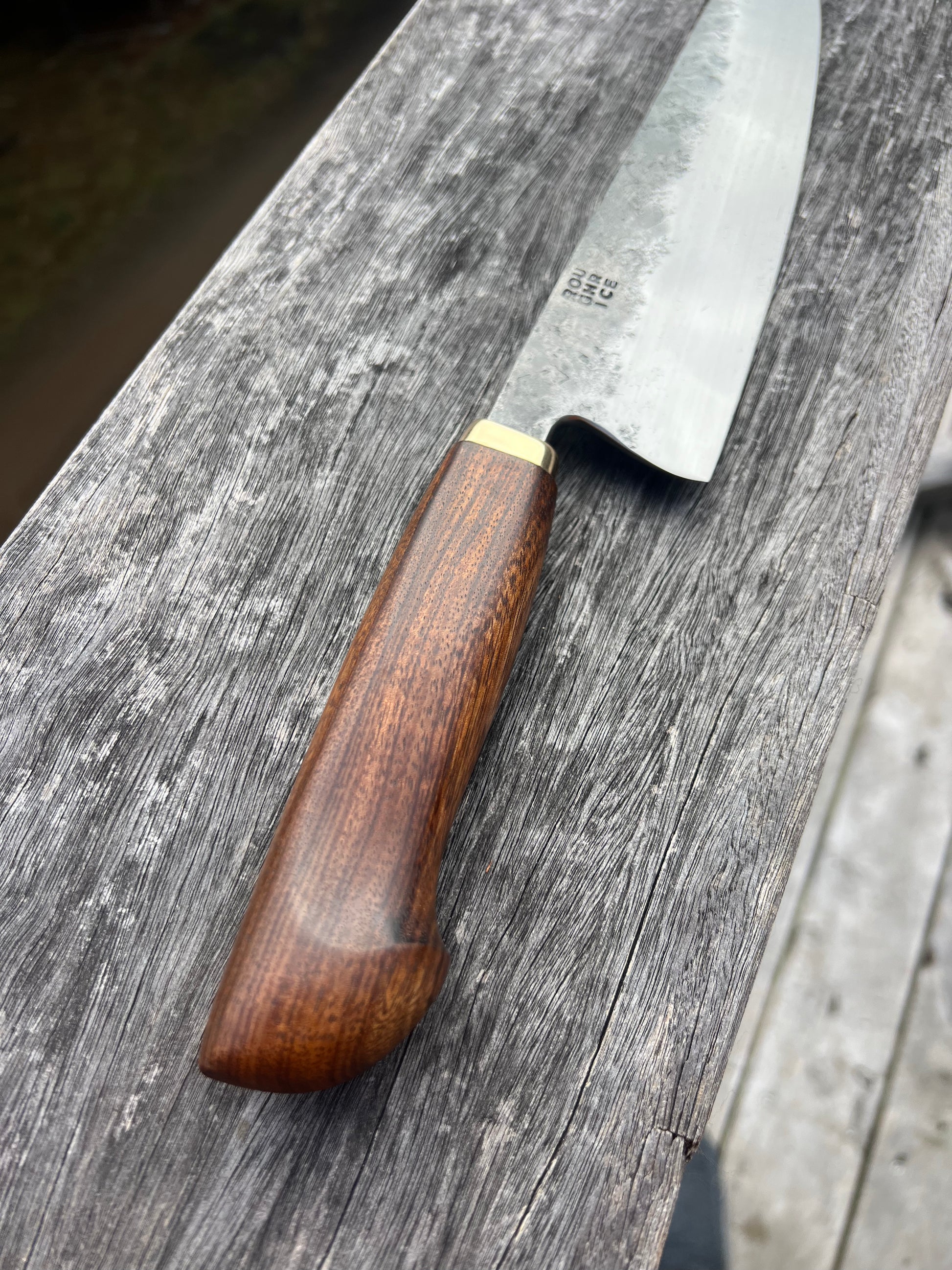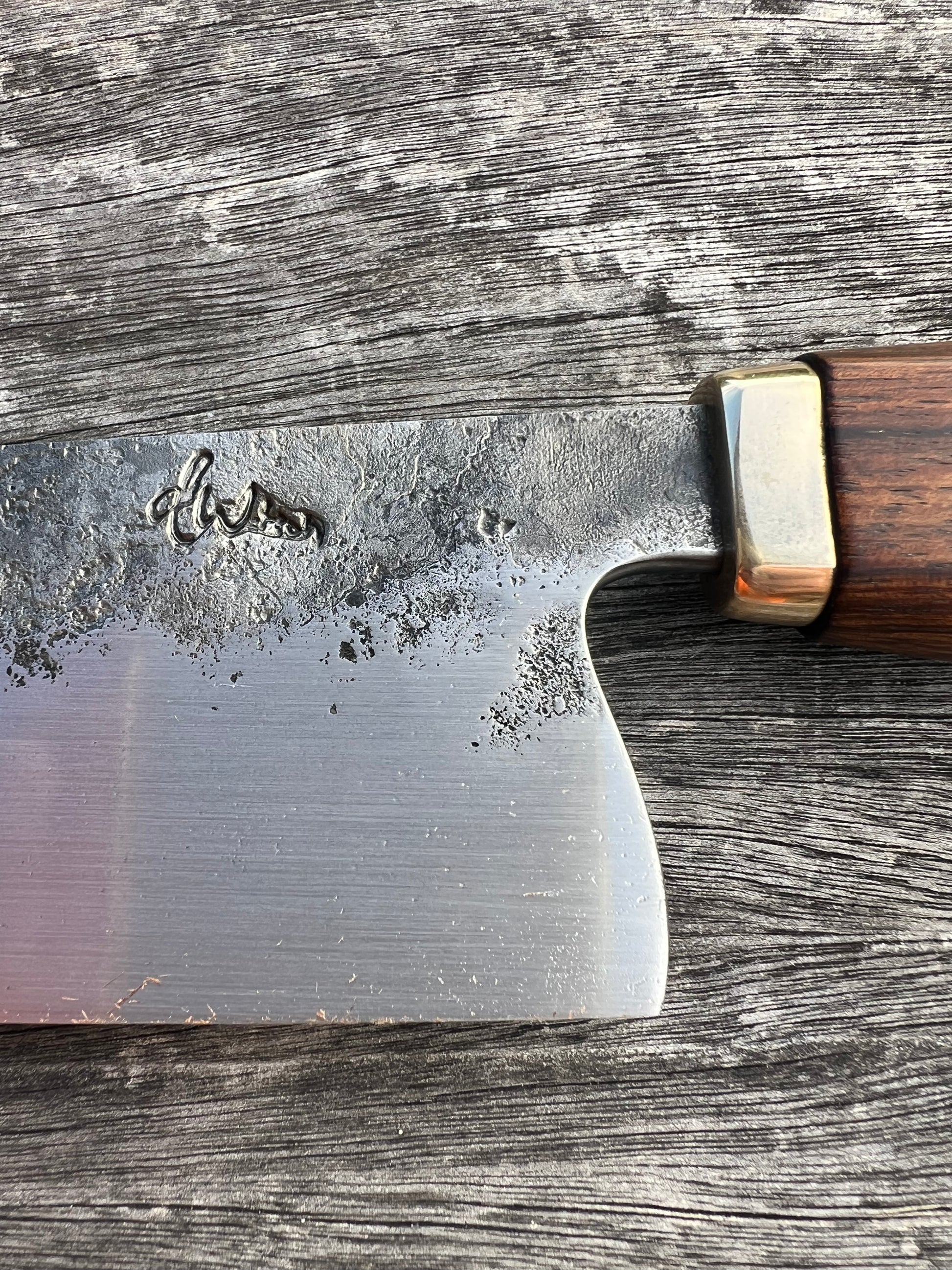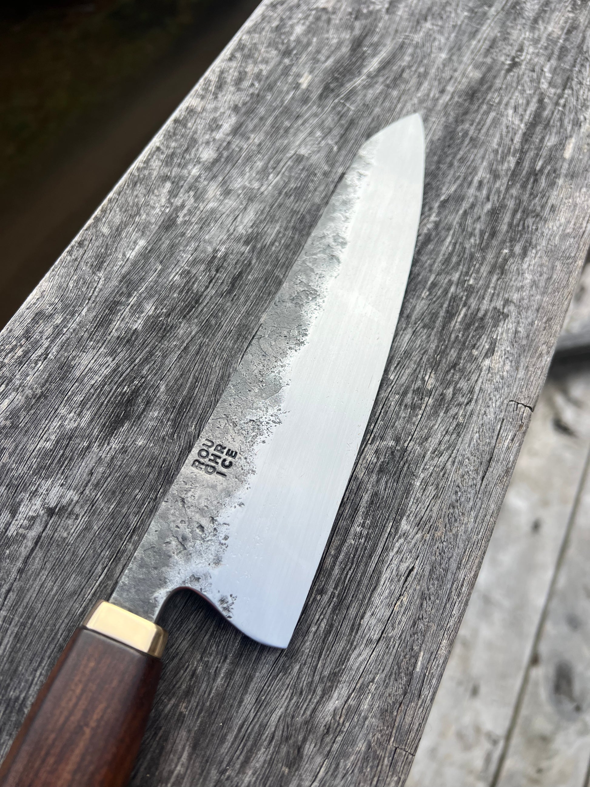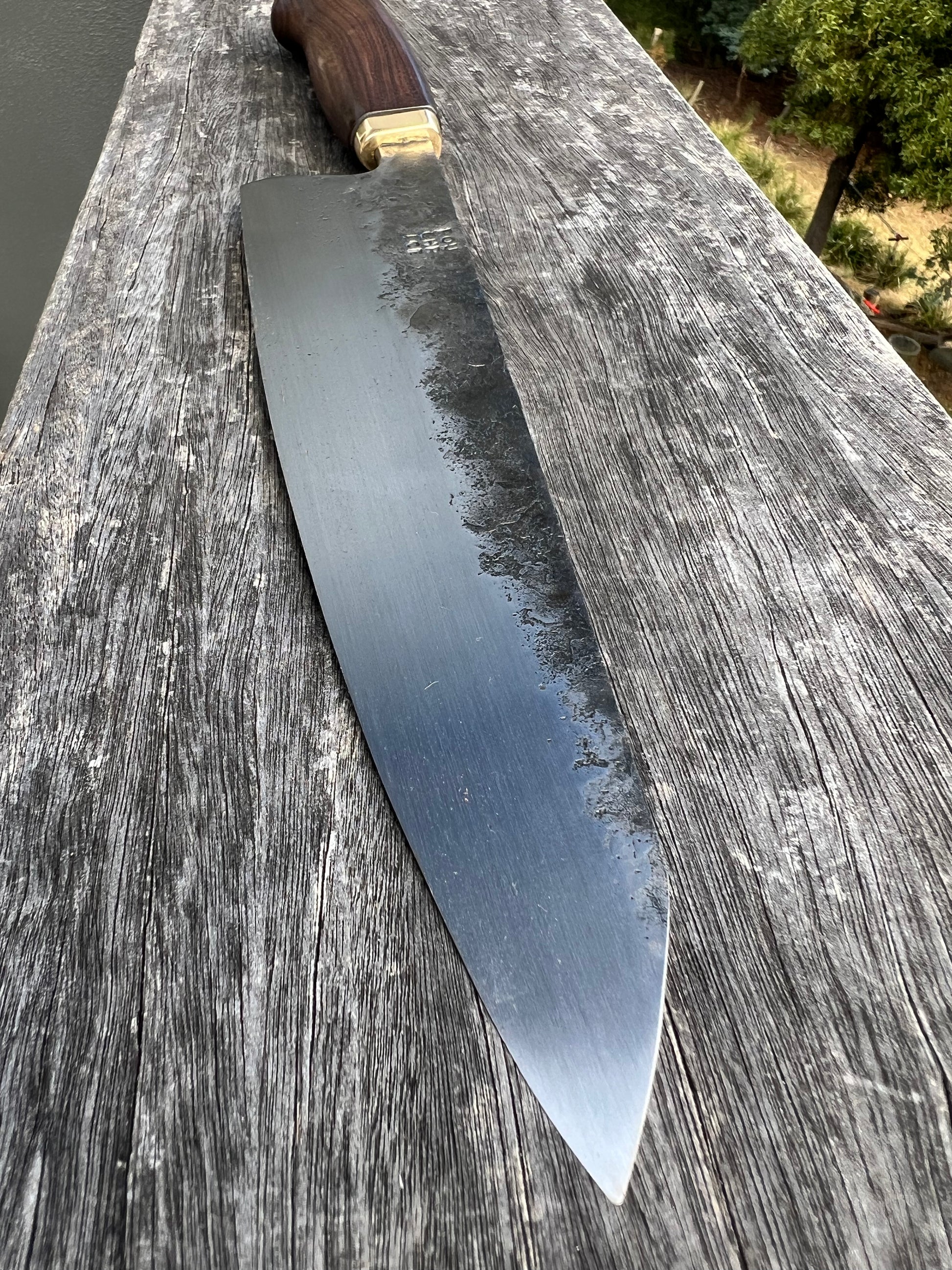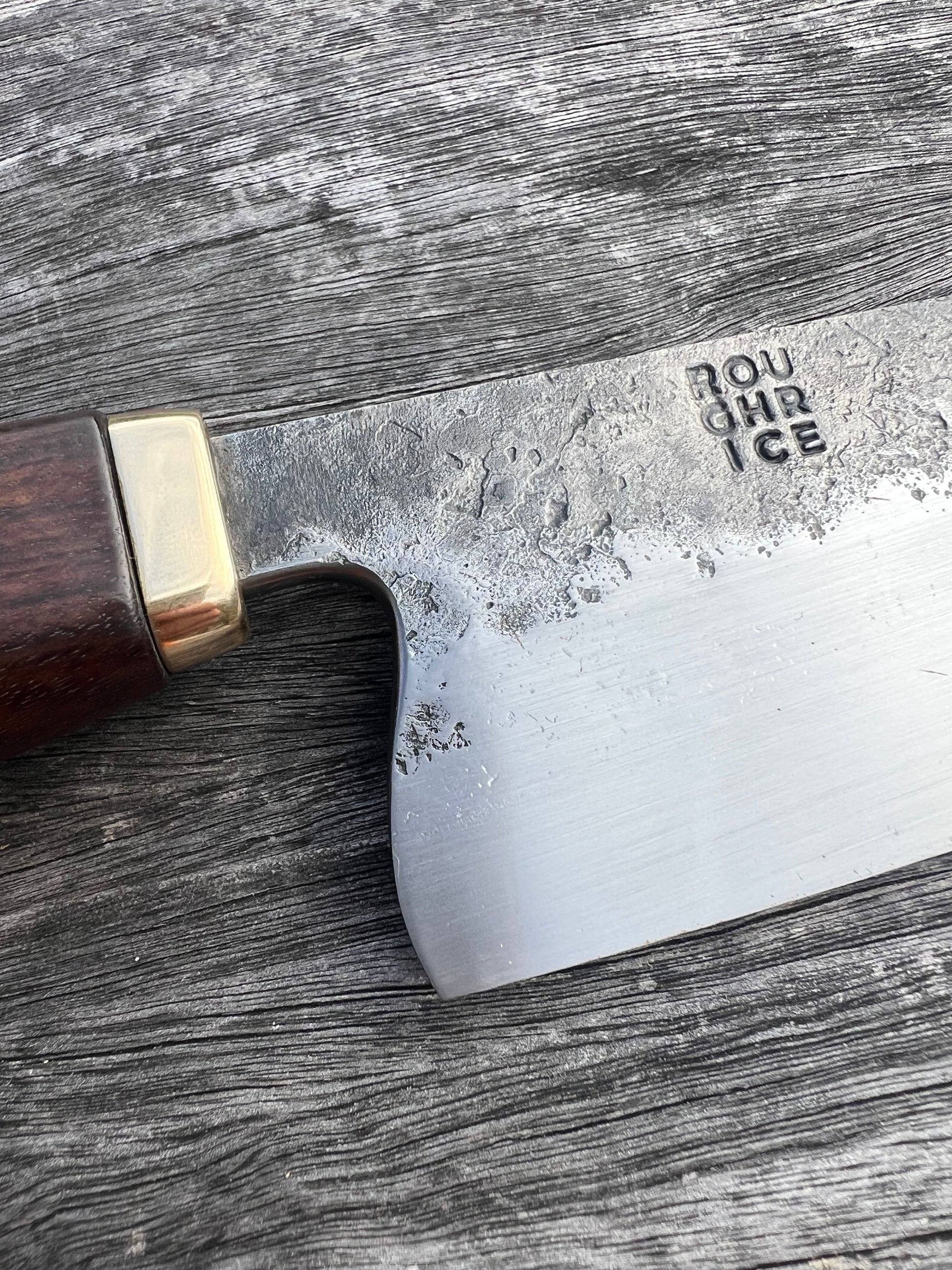 Made from high quality carbon steel (80crv2, with alloying elements of vernadium and chromium) the blade is 240mm long and 52mm at the heel. It has been forged to shape and tapers from 5.5mm thick at the connection to the handle down to 1.5mm at the tip of the blade. This creates a blade heavy balance, with a robust sense of mass around the heel. As such it’s incredibly versatile - suited to processing all manner of vegetables, fruits and proteins yet also lends itself to more intricate work at the ‘pointy end’. Slicing truly is a pleasure.