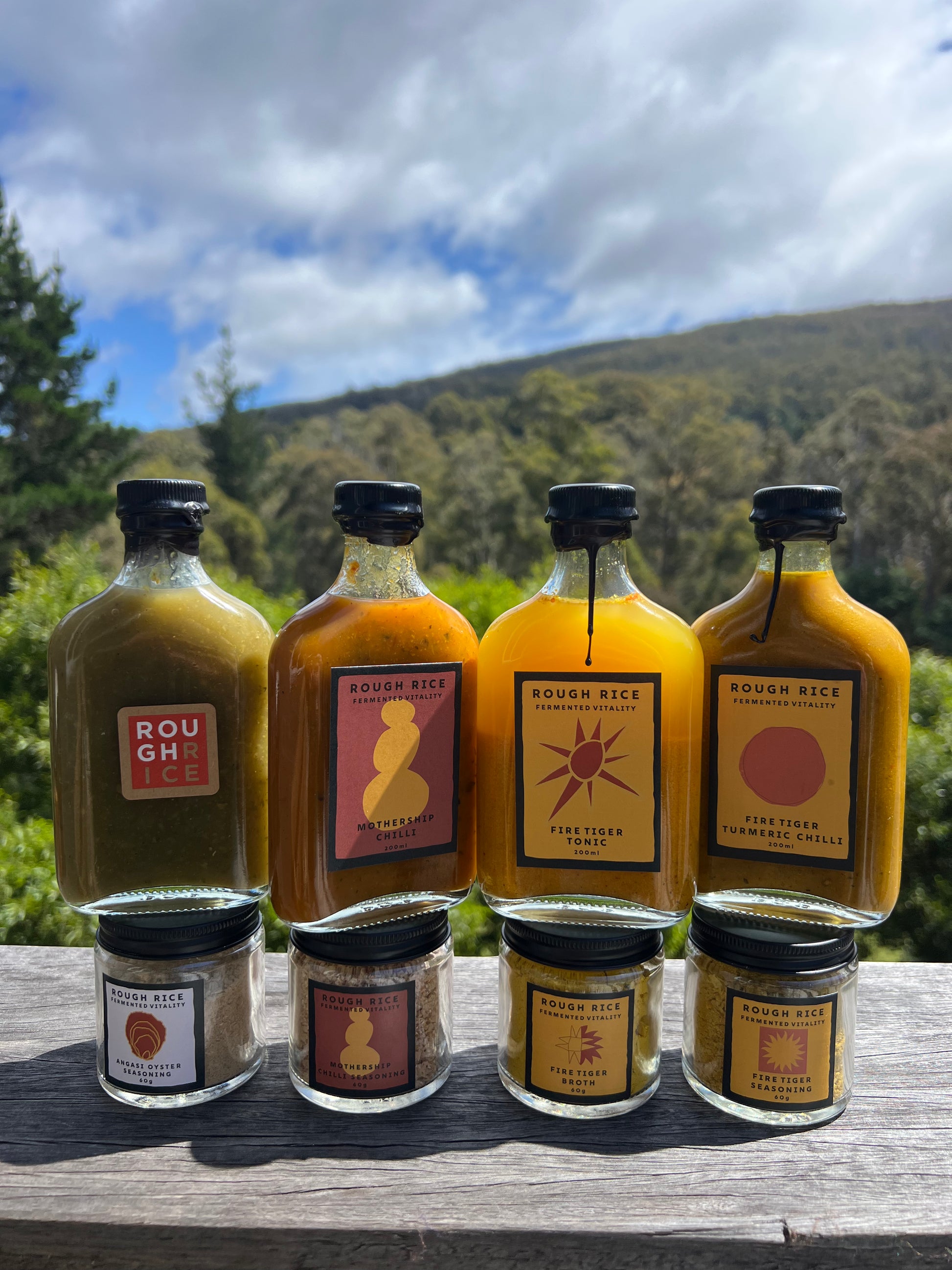The Fire Tiger Vitality range is built around curcuma longa, aka turmeric. For the past 4 years my good friend Jono has been growing this turmeric on an organic farm in Natural Bridge (Qld). I’ve then brought it down to Tassie, fermented it (which hugely increases the bioavailability of the curcumin) and played around with concoctions which maximise flavour and health benefits. Both of the following are designed to promote gut health / happy biome, keep your immune system in check, aid digestion and as an anti-inflammatory.