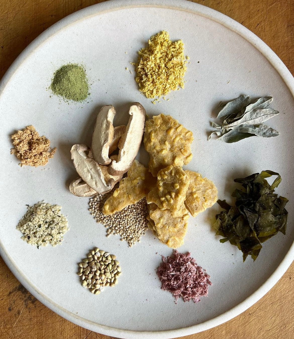 (Seasoning sachet) - fermented turmeric + ginger (grown organically in Natural Bridge), saltbush (foraged in lutruwita), wakame (invasive weed from Northern Bruny), fermented borscht (local/organic beetroot, turnip, carrot), hemp seeds, buckwheat, ‘mothership’ (fermented organic chilli, vegetables, fruits and herbs x 30+) + sea lettuce (locally harvested).